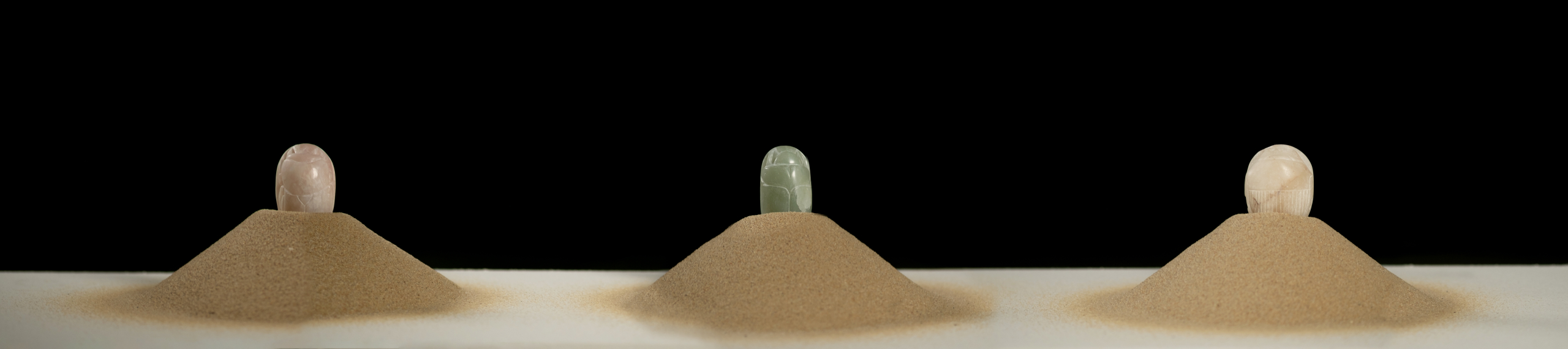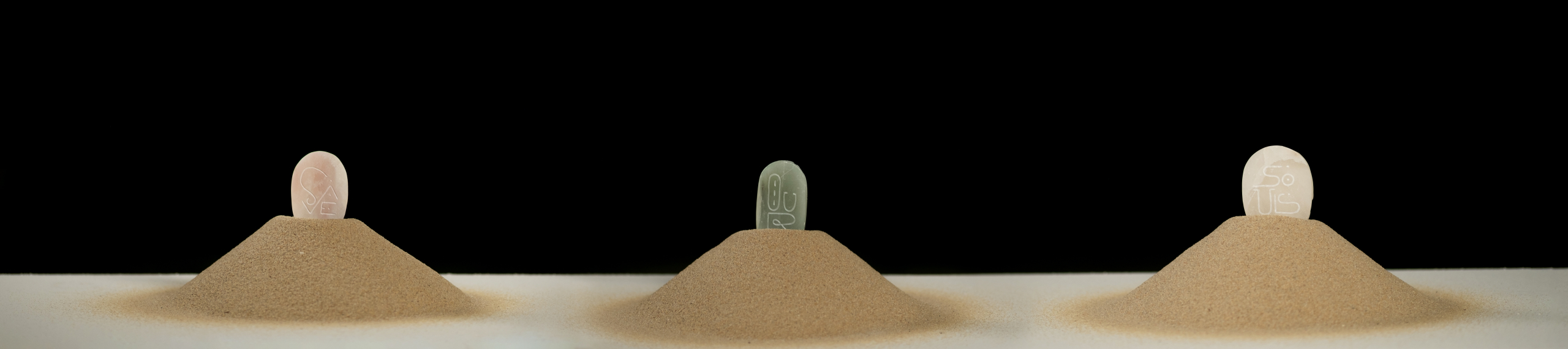 S.O.S. est l’interprétation en code Morse du signal de demande d’assistance immédiate. Plusieurs significations lui ont été attribuées, dont « Save Our Souls » (sauvez nos âmes). C’est le message que porte cette série de trois scarabées, inspirés des amulettes de l’Egypte antique. Sous leur base lisse, les pharaons y faisaient inscrire des hiéroglyphes afin de vanter les mérites de leur règne, les expédiant ensuite aux quatre coins de l’empire. Ici, une réinterprétation typographique reprend l’acronyme en titre, comme un appel de détresse pour ces animaux autrefois sacrés.